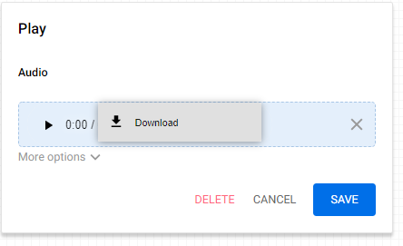 Audio files can be downloaded or played back in the flow designer section, click on the node and you should see an audio player. To download your files click on the 3 dots and click 'Download'.