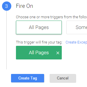 We want the tag to gather data from all the pages on your website, so click All Pages and then click Create Tag.