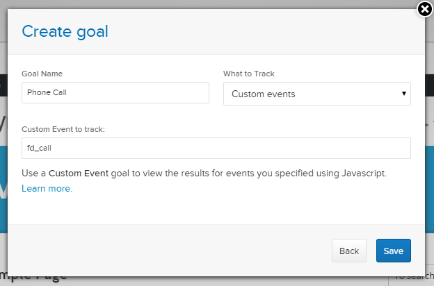 Enter a goal name, we suggest Phone Call. Change the What to Track drop down to Custom events. And in the Custom Event to track field enter fd_call and click Save.
