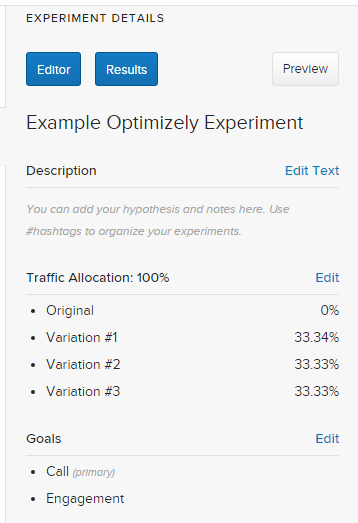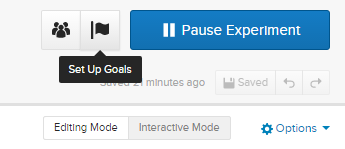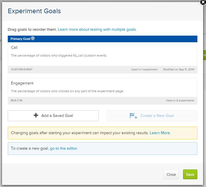 If you experiment hasn't started running click on the Create a New Goal button and move onto Step 6. If your experiment is currently running click on go to the editor and continue to Step 4.