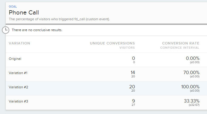 The Business 1300 tracking script and server are configured to automatically send goal completions to Optimizely where it detects Optimizely being used on the website. The catch these goal conversions in Optimizely, create a custom goal in Optimizely to catch the event fd_call.