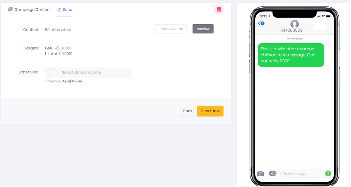 Here you can send a test message by using the preview number box or schedule the time and date you would like the message to be sent. The Preview of the message and an estimate of the campaign cost is shown.