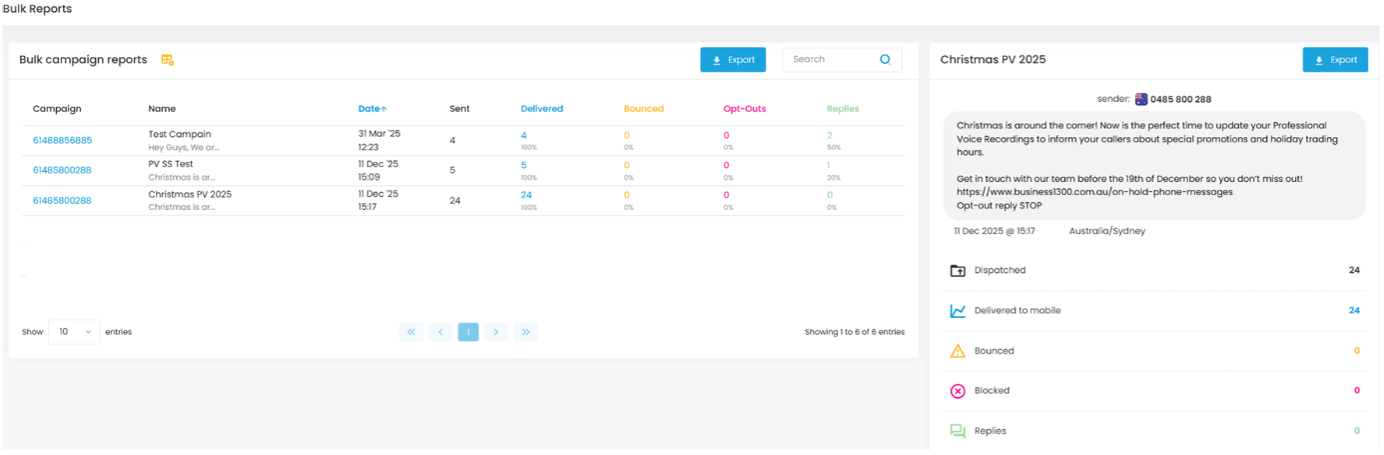 1. Navigate to SMS > Bulk Reports to show you the list of recent SMS campaigns, the date they were sent and the results of the campaign