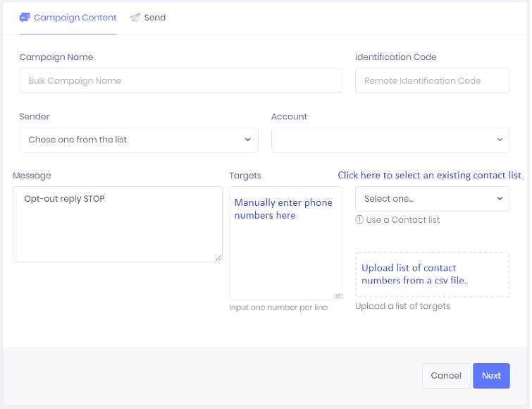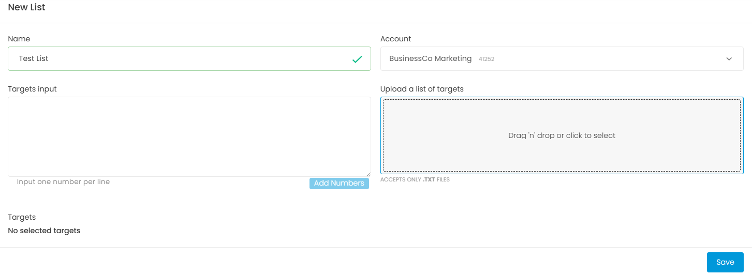 - Targets - List of numbers you would like to send the SMS campaign to.