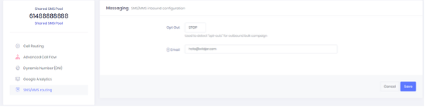 3. Select the [SMS/MMS routing] option then enter, add, or edit the email address you would like the inbound SMS to be forwarded to.