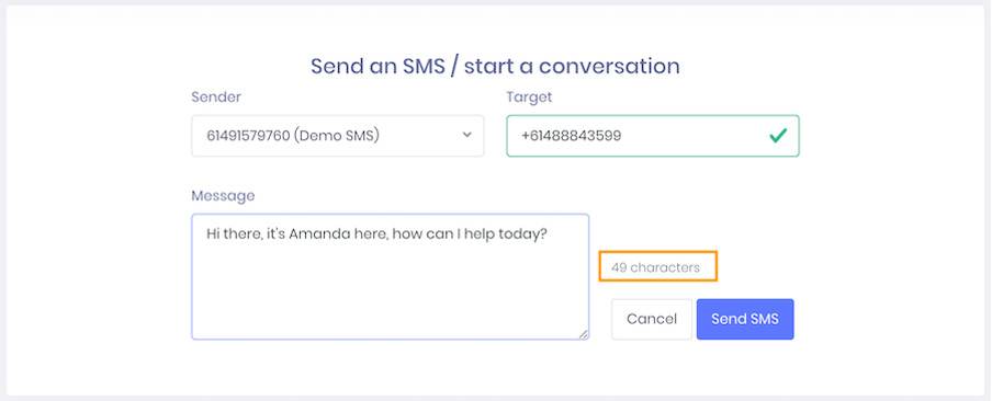 5. Enter the content of your SMS in the Message text box. There is a counter on the right-hand side of the text box to show you how many characters you've used and how many SMS parts the message needs to be sent in.