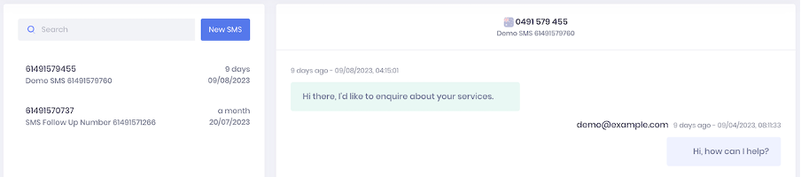 In the left-hand column, you'll see your recent SMS conversations, including the caller and mobile number the SMS was sent to. The search box allows you to filter conversations by the customer’s number, your mobile number or by name.
